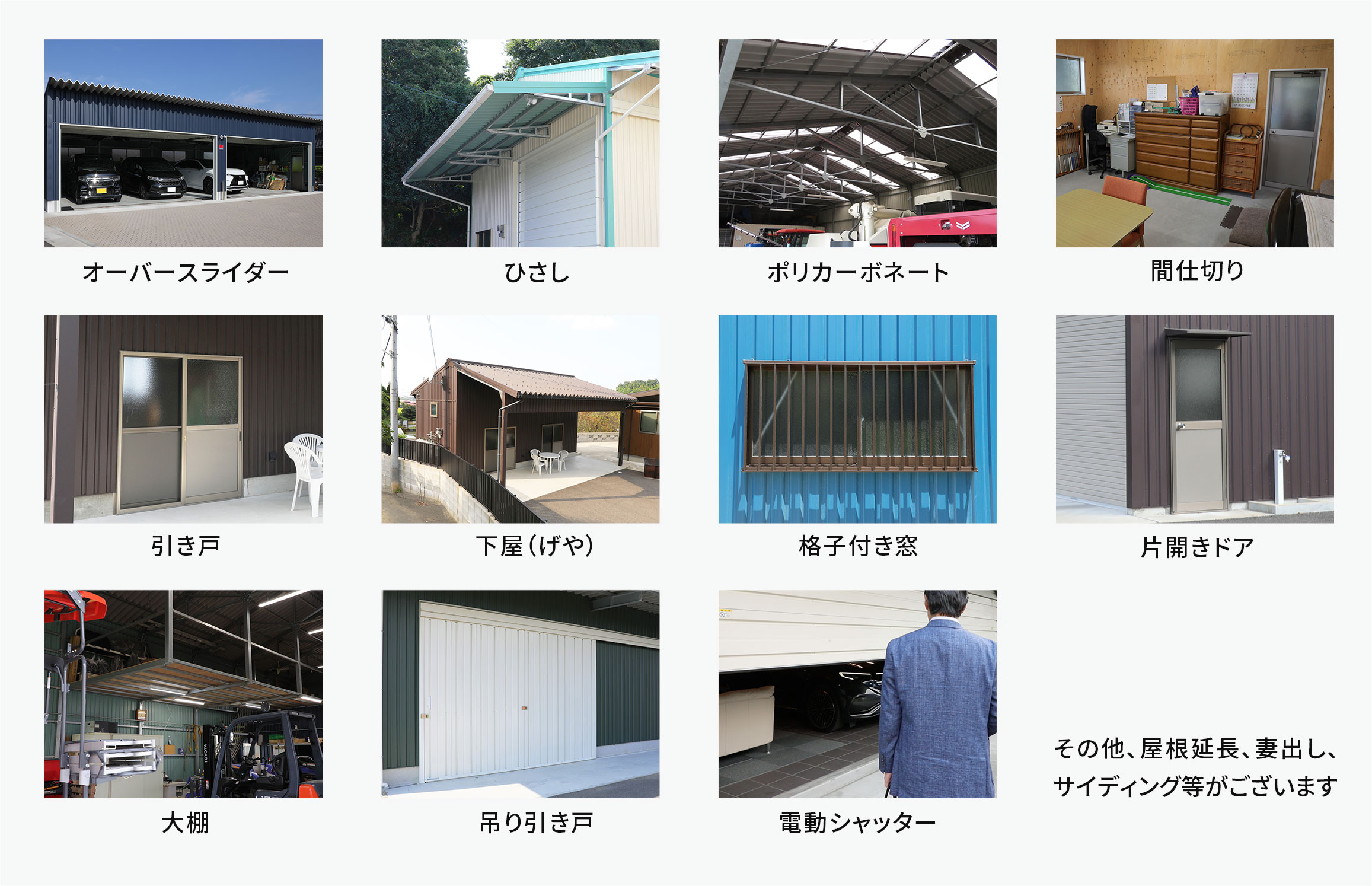 間口、奥行、軒高すべてを自由自在にカスタム。「限られた土地なので定型の倉庫やガレージを建てることができない」というお悩みも解決。ひとりひとりに寄り添い、それぞれの希望に合ったご提案をさせていただきます。 使いやすさを追求したガレージも、あなたの夢、想いがつまった世界に一つだけのユニークなガレージも、「リョーノー自由設計」が実現します。